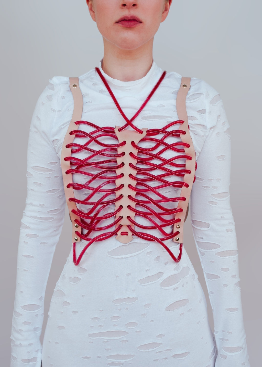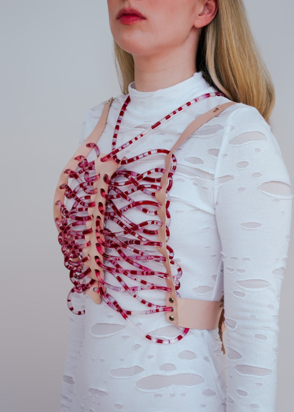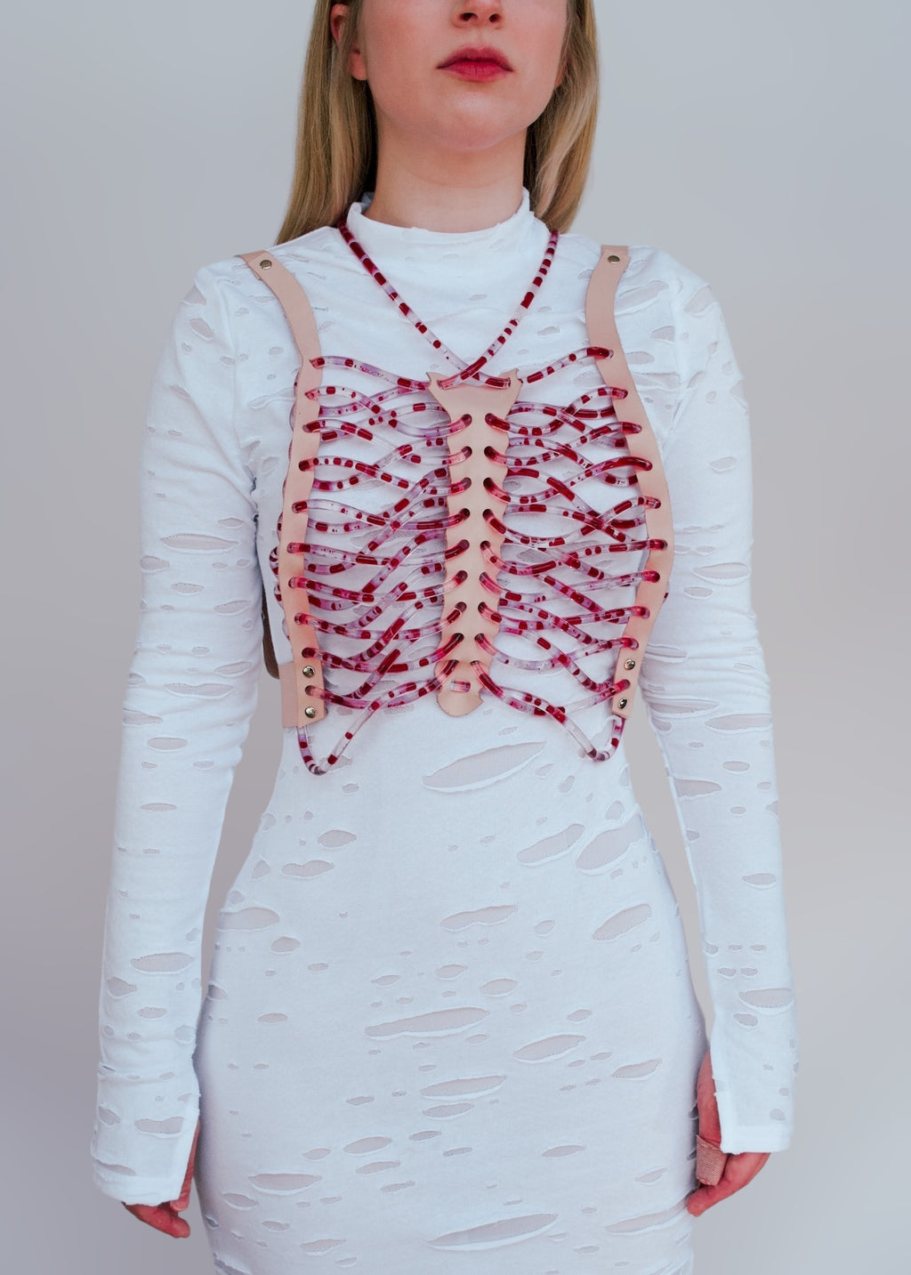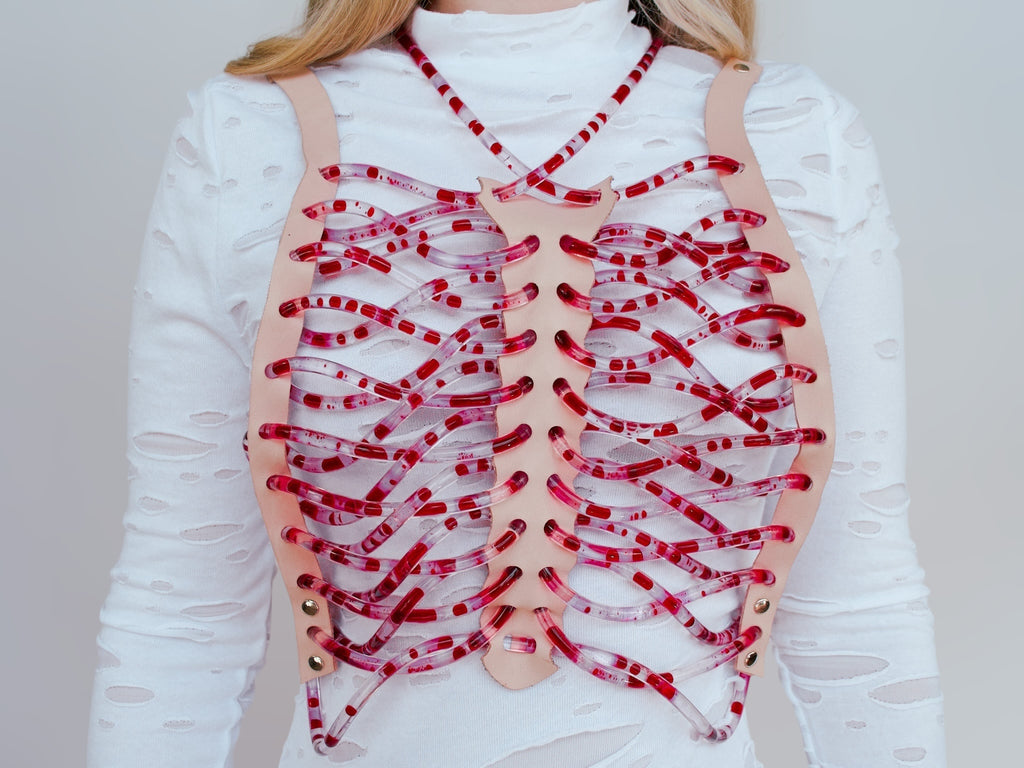 Known online as the Liquid Corset™, this wearable art piece fits across the body as a harness, emulating a ribcage and spine, pumping a blood-like fluid throughout. A portable battery-powered pump circulates liquid through the corset, making it a unique and captivating accessory. This one-of-a-kind rib liquid corset is perfect for raves, cosplay, punk, goth, and drag queen communities.