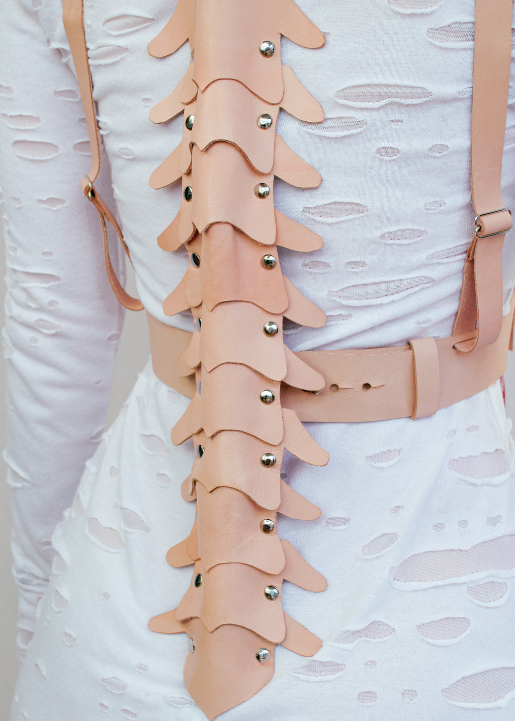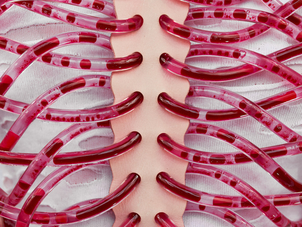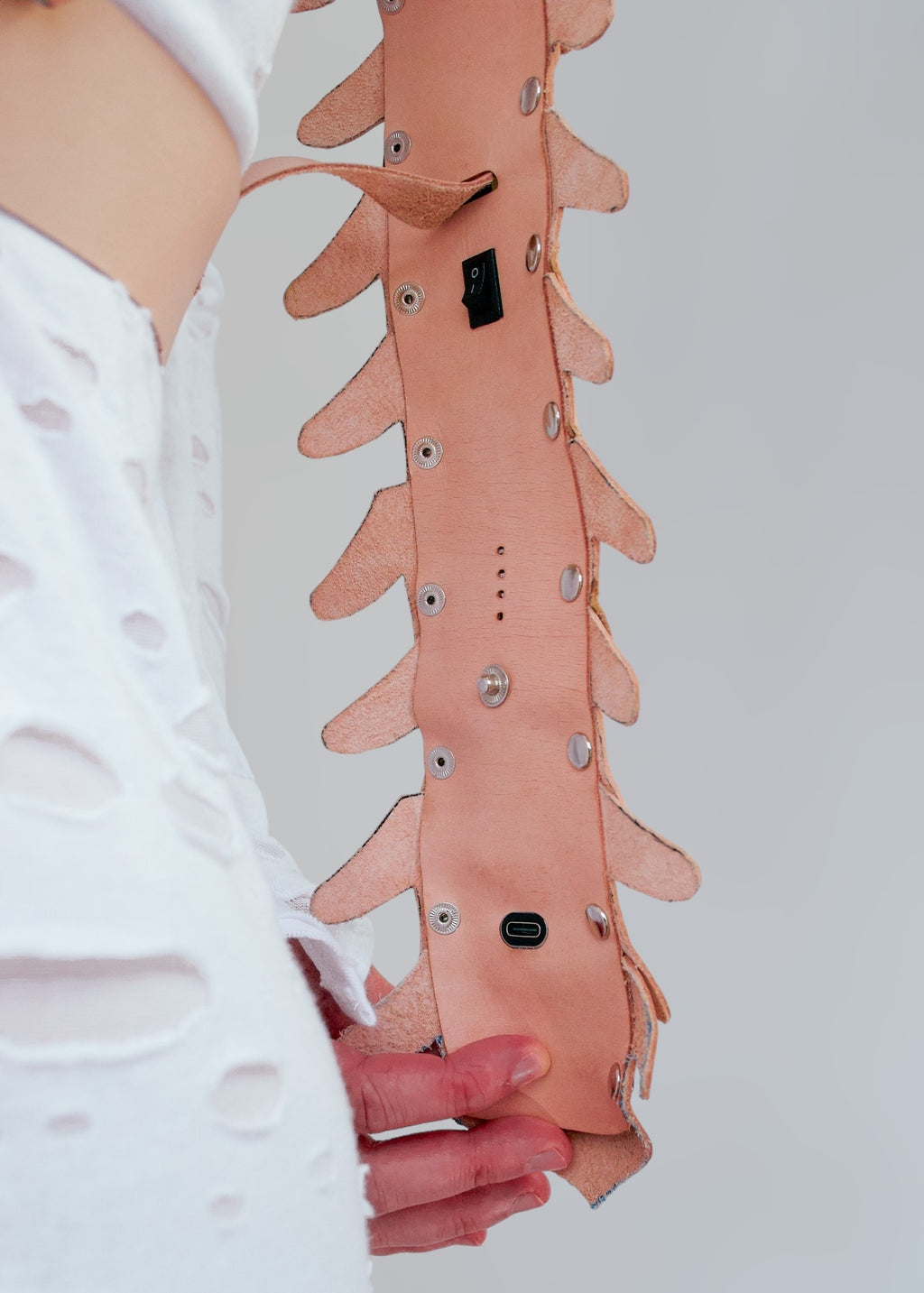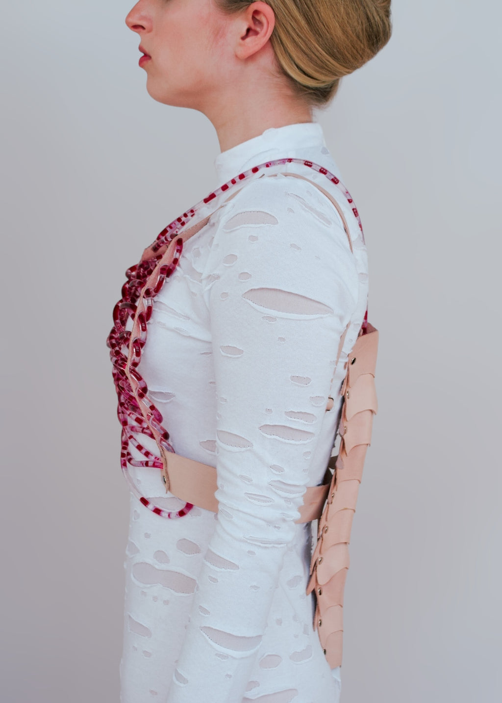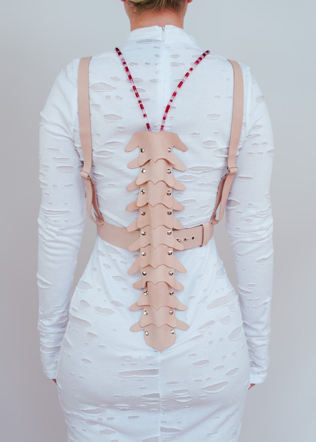 Known online as the Liquid Corset™, this wearable art piece fits across the body as a harness, emulating a ribcage and spine, pumping a blood-like fluid throughout. A portable battery-powered pump circulates liquid through the corset, making it a unique and captivating accessory. This one-of-a-kind rib liquid corset is perfect for raves, cosplay, punk, goth, and drag queen communities.