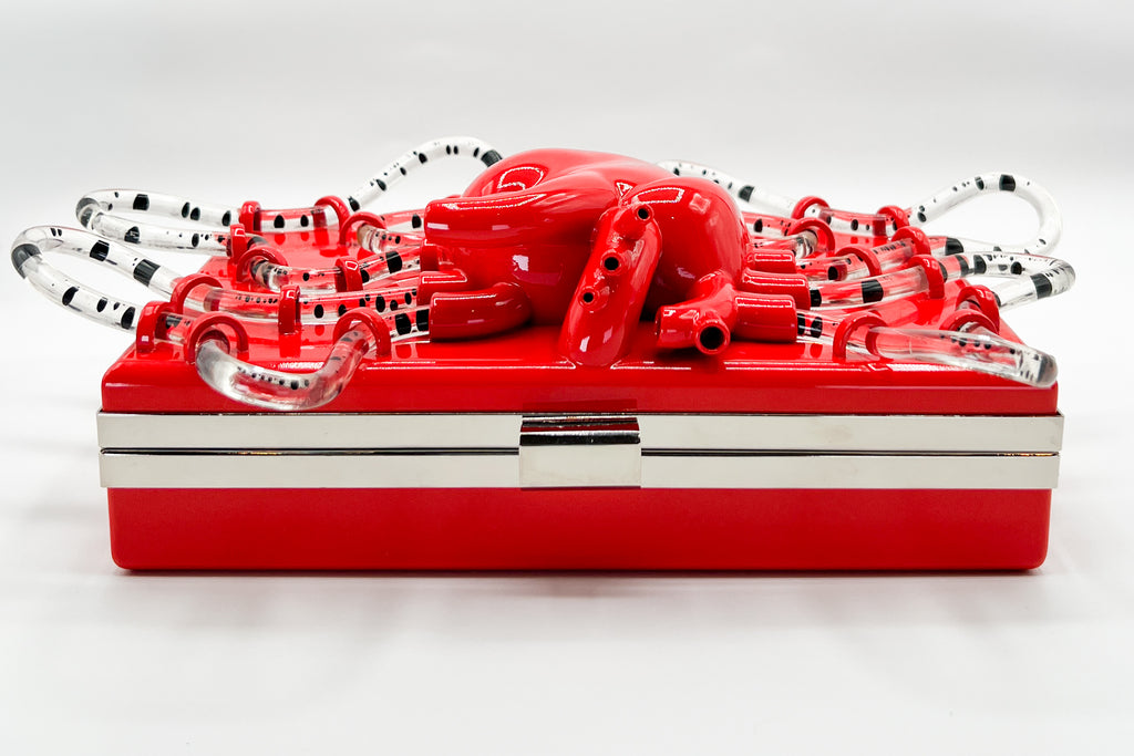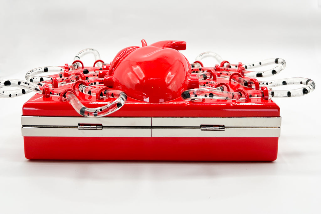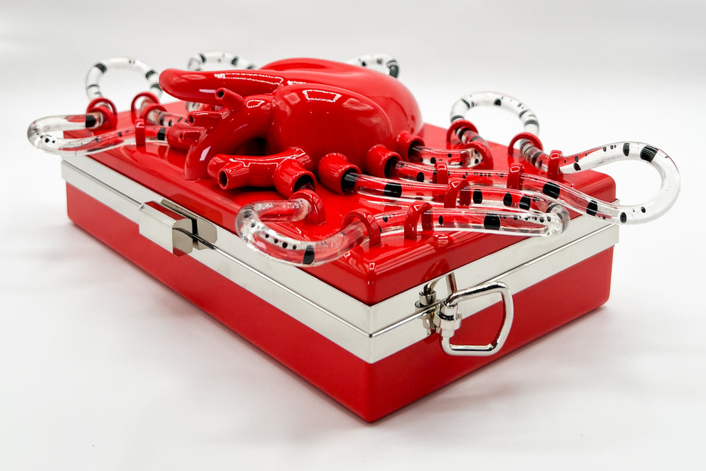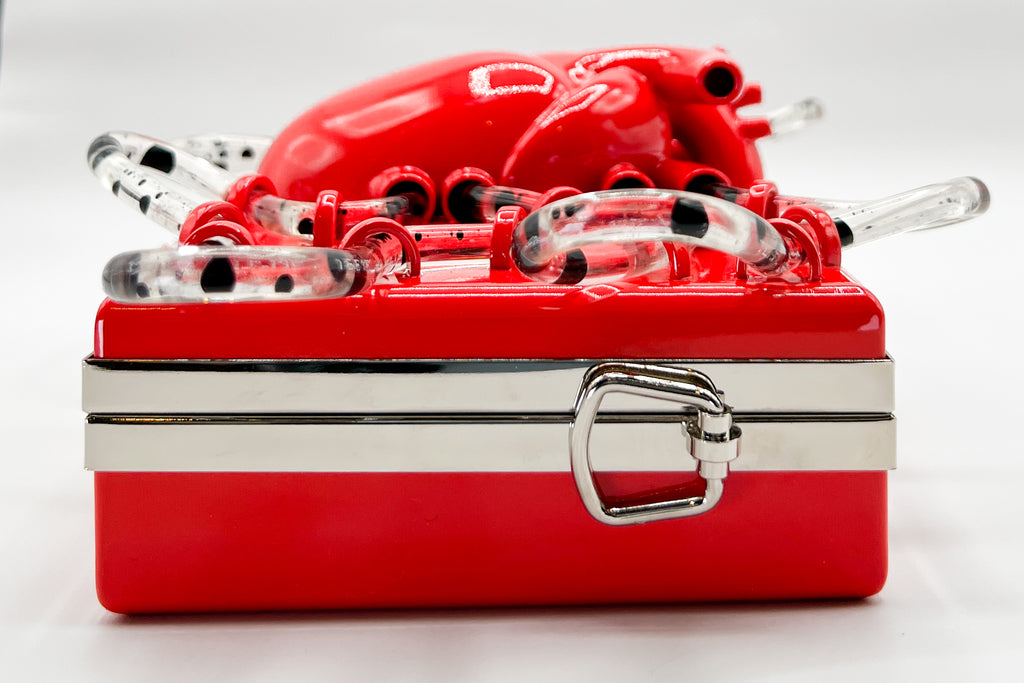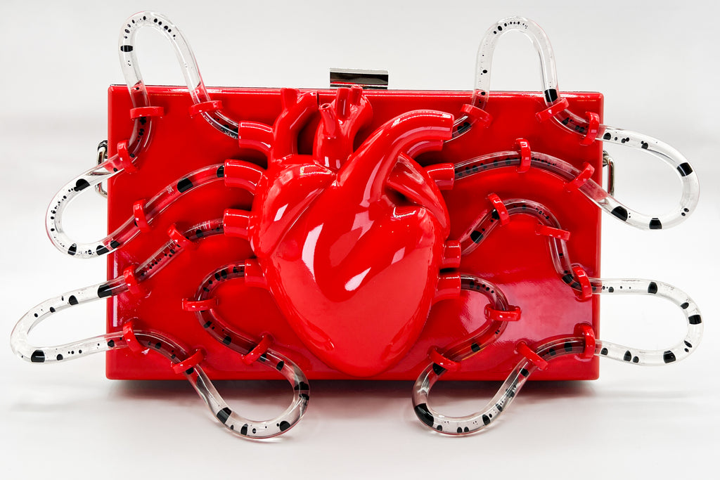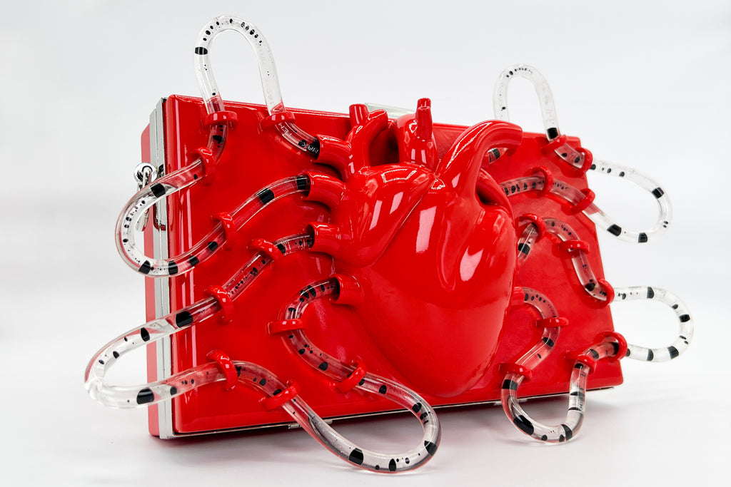The Pumping Heart Bag™ is a sculptural tech piece that blurs the line between body and object. Designed and engineered by wearable-tech artist Brittany Anne Cohen, each bag is 3D-sculpted and hand-finished. No two will ever be alike — imperfections in the print, the way the liquid flows, even the rhythm of the pump create a singular experience every time you power it on.